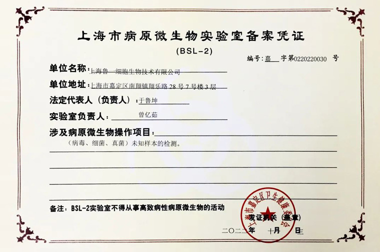 为响应国务院《病原微生物实验室生物安全管理条例》以及《实验室-生物安全通用要求》(GB19489-2008)等文件要求,3377电竞细胞研发实验室在经过布局整改、文件完善、人员培训等一系列准备工作后,于2022年9月3日向上海市嘉定区卫健委提交了生物安全二级实验室备案申请书,次月该申请审核通过 。